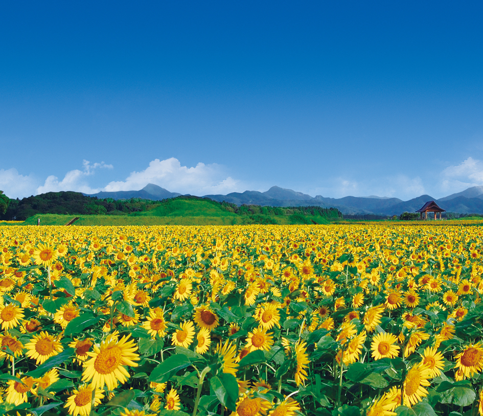 日本でも珍しい古墳とひまわりのハーモニーが楽しめます。