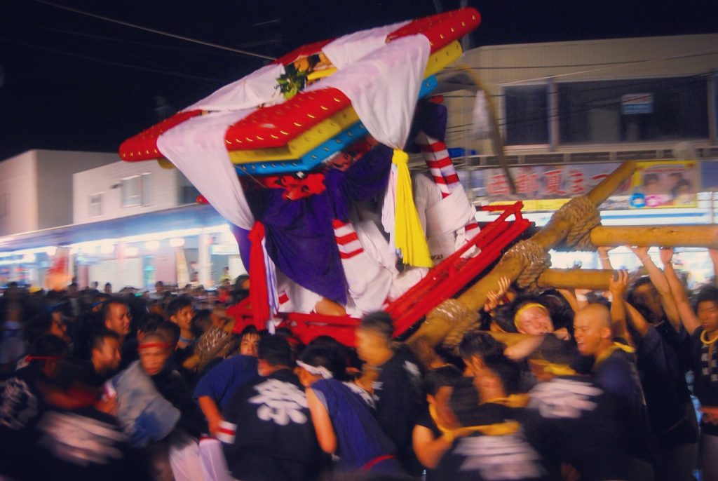 まつり初日と最終日に総勢200人の若者が、100年以上の歴史ある太鼓台を担いで練り歩く。太鼓台の柱にさらし布で縛り付けられた子どもたちが、太鼓台が真っ逆さまになっても太鼓を打ち続ける姿は圧巻!