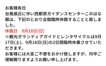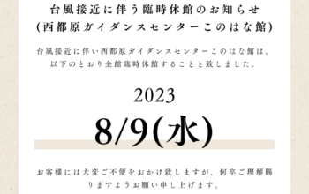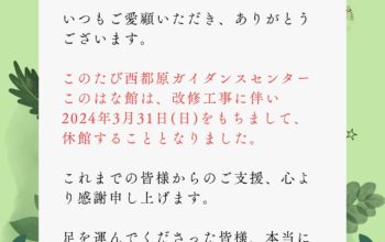 西都原ガイダンスセンターこのはな館 Guidance center 2025.11.26 🍖✨ 西都原de ASOBO!デイキャンプ開催!✨🍖 こんにちは、このはな館です🌼 本日は【 イベント 】についてご紹介致します♪ &... 2025.10.20 【このはな館】さるまわしパフォーマンスのお知らせ 西都原ガイダンスセンターこのはな館では秋の季節イベントとしてさるまわしパフォーマンスを開催します... 2025.10.06 【このはな館】さるまわしパフォーマンスのお知らせ 西都原ガイダンスセンターこのはな館では秋の季節イベントとしてさるまわしパフォーマンスを開催します... 2025.09.17 【このはな館】このはな館に来られたお客様にお店のPRをしてみませんか?西都市内周遊カード参加店舗募集のお知らせ 西都原ガイダンスセンターこのはな館では、来館されたお客様を対象に西都市内のお店を紹介する新たな... 2025.09.04 【このはな館】台風接近に伴う臨時休館のお知らせ お客様各位 台風接近に伴い西都原ガイダンスセンターこのはな館は、以下のとおり全館臨時休館すること... 2025.08.15 【このはな館】音楽イベント「THE LIVE」開催のお知らせ 西都原ガイダンスセンターこのはな館では音楽イベント「THE LIVE」を開催します。 本イベン... 2025.07.16 【このはな館】青木宣親さん背番号モニュメント設置のお知らせ 西都原ガイダンスセンターこのはな館では元東京ヤクルトスワローズで日向市出身の青木宣親さんの引退... 2025.06.26 【このはな館】世界でひとつだけ オリジナル竹灯籠をつくろう! 竹灯籠づくり参加お申込みフォーム 講座期間令和7年8月16日(土)、8月30日(日) ※全8回費... 2025.06.26 【このはな館】西都のちょっとイイ所募集 観光で来られたお客様に『もっと西都のイイ所』を知ってもらいたい!『お寺や神社』『神話の場所』『パ... 2025.06.01 【このはな館】アンブレラスカイ実施中 西都原ガイダンスセンターこのはな館では6月1日(日)から屋内にてアンブレラスカイを実施中です。... もっと見る 西都原ガイダンスセンター このはな館 0983-43-6230 FAX. 0983-43-6238 施設概要 物産販売 レストラン レンタサイクル 交通アクセス 新着情報 お問い合わせ 西都市観光協会 西都原ガイダンスセンターこのはな館 フォトアルバム 西都市の天気 西都原ガイダンスセンターこのはな館 グリーンツーリズム スポーツランド ニニギくん&コノハナちゃん 年間イベントカレンダー 体験する 観光パンフレット おいでよ花のまち西都市へ 観光ガイド フードデリバリー西都 動画 【宮崎県西都市PR動画】古代ロマン西都 古代人のモニュメント-南国宮崎の古墳景観-(日本語ショート)
