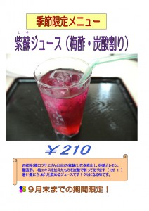 西都原ガイダンスセンターこのはな館内レストラン「旬菜家」にて、暑い夏にぴったりのドリンク「紫蘇(しそ)ジュース」を9月末までの期間限定で販売中です。