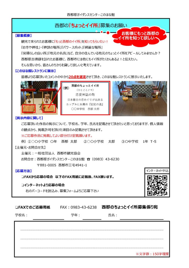 観光で来られたお客様に『もっと西都のイイ所』を知ってもらいたい!『お寺や神社』『神話の場所』『パワ-スポット』『綺麗な場所』『見晴らしの良い所』『地元の名店』など、自分の住んでいる地元のちょっとイイ所をアピ-ルしてみませんか?西都原古墳群を訪れたお客様に、西都市には他にもイイ所がたくさんあるよ!と伝えたい。そんな思いから、学生の皆さんのちからを貸して欲しいと考えています。