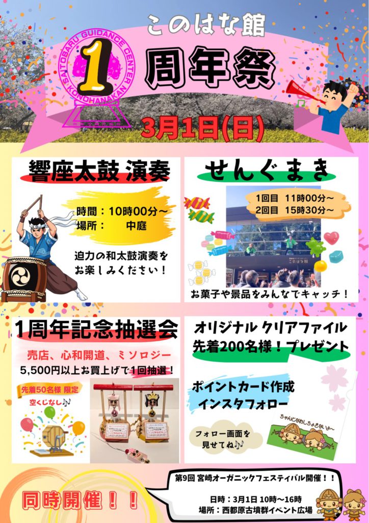 西都原ガイダンスセンターこのはな館では3月1日(日)にリニューアルオープン1周年を記念し『このはな館1周年祭』を開催します。