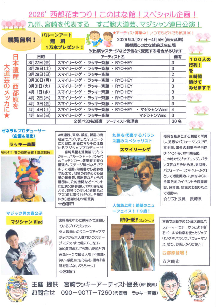 西都原ガイダンスセンターこのはな館にて3月27日(金)~4月5日(日)の期間中、大道芸・マジシャンの公演が行われます。