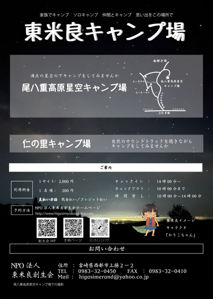 | ご予約・お問い合わせ | NPO 法人東米良創生会 宮崎県西都市上揚2−2 電話:0983−32−0450 FAX:0983−32−0410 Mail:higasimerand@yahoo.co.jp 公式ウェブサイト:https://higasimerasouseikai.com |