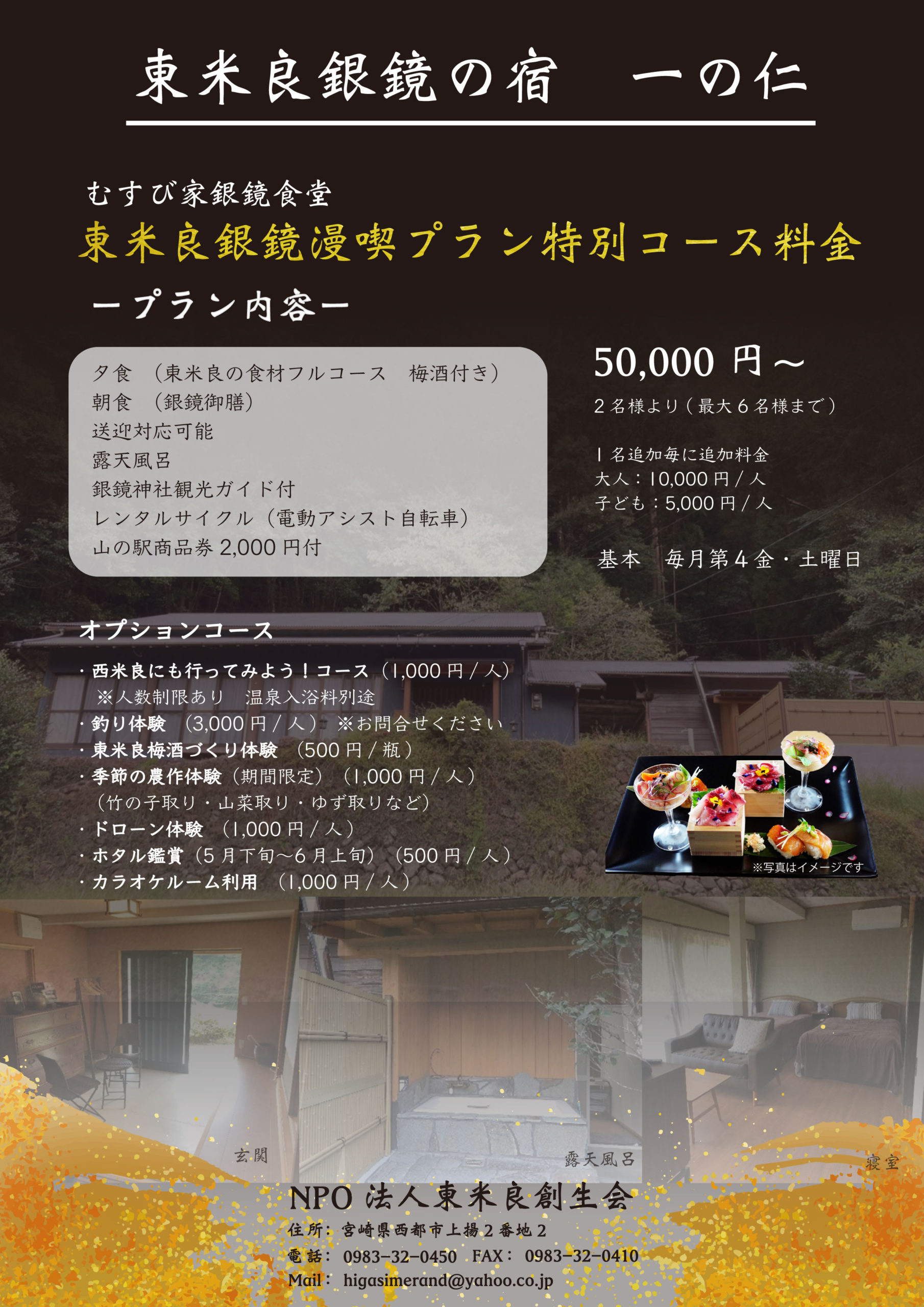 | ご予約・お問い合わせ | NPO 法人東米良創生会 宮崎県西都市上揚2−2 電話:0983−32−0450 FAX:0983−32−0410 Mail:higasimerand@yahoo.co.jp 公式ウェブサイト:https://higasimerasouseikai.com |