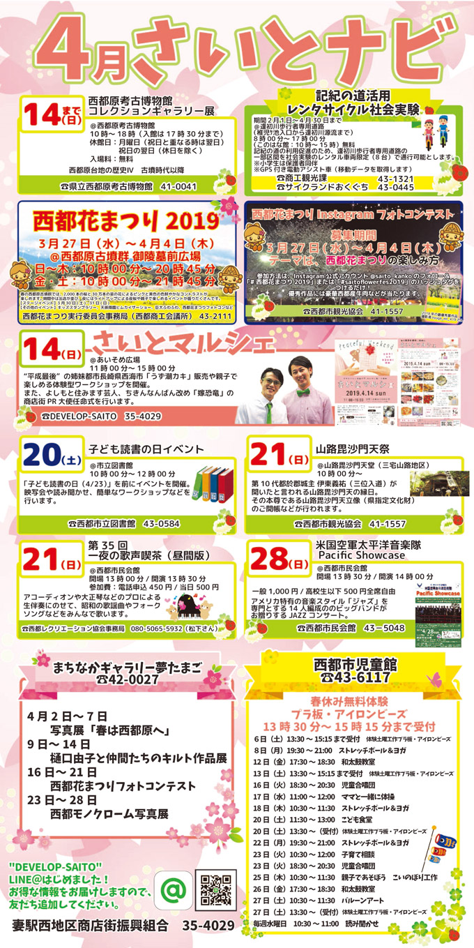 新着情報 妻駅西地区商店街振興組合 4月さいとナビ 2019.03.12 妻駅西地区商店街振興組合で作成している「さいとナビ」の4月号が完成しました。イベント情報が盛りだくさんです。 「さいとナビ」についてのお問合せ妻駅西地区商店街振興組合 TEL 0983-35-4029 ホーム新着情報妻駅西地区商店街振興組合 4月さいとナビ フォトアルバム 西都市の天気 西都原ガイダンスセンターこのはな館 グリーンツーリズム スポーツランド ニニギくん&コノハナちゃん 年間イベントカレンダー 体験する 観光パンフレット おいでよ花のまち西都市へ 観光ガイド フードデリバリー西都 動画 【宮崎県西都市PR動画】古代ロマン西都 古代人のモニュメント-南国宮崎の古墳景観-(日本語ショート) Instagram 【第38回西都古墳まつり】たいまつ行 さらに読み込む... Instagram でフォロー Facebook 一般社団法人西都市観光協会
