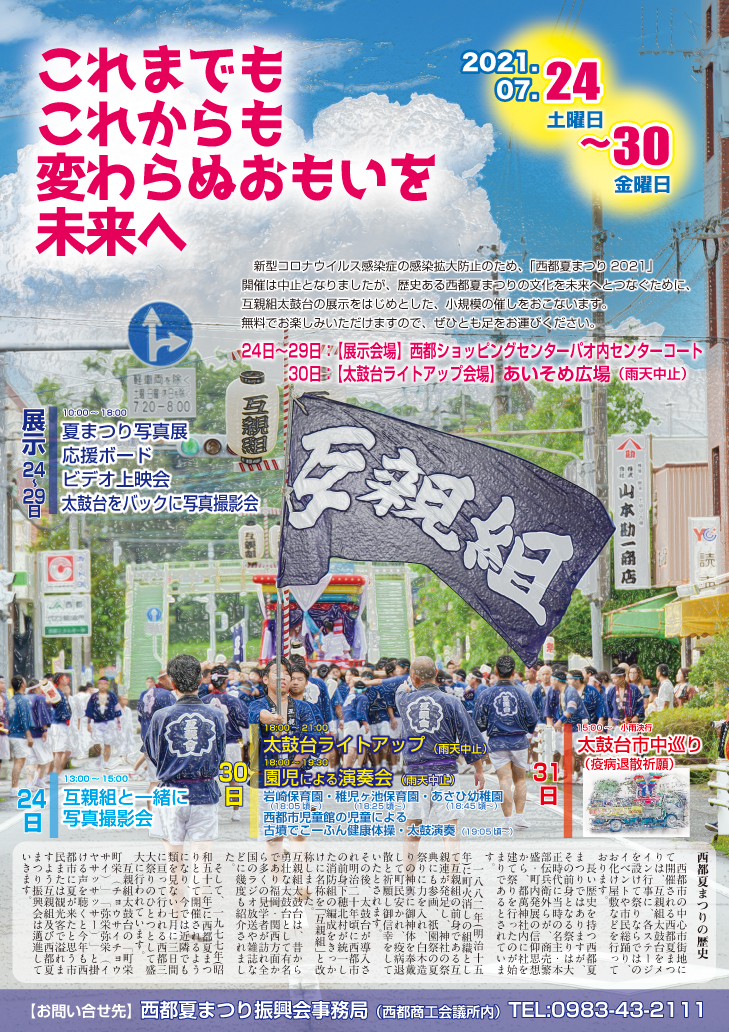 新型コロナウイルス感染症拡大防止のため、「西都夏まつり2021」は中止となりましたが、歴史ある西都夏まつりの文化を未来へとつなぐために、互親組太鼓台の展示をはじめとした、小規模の催しを行います。
