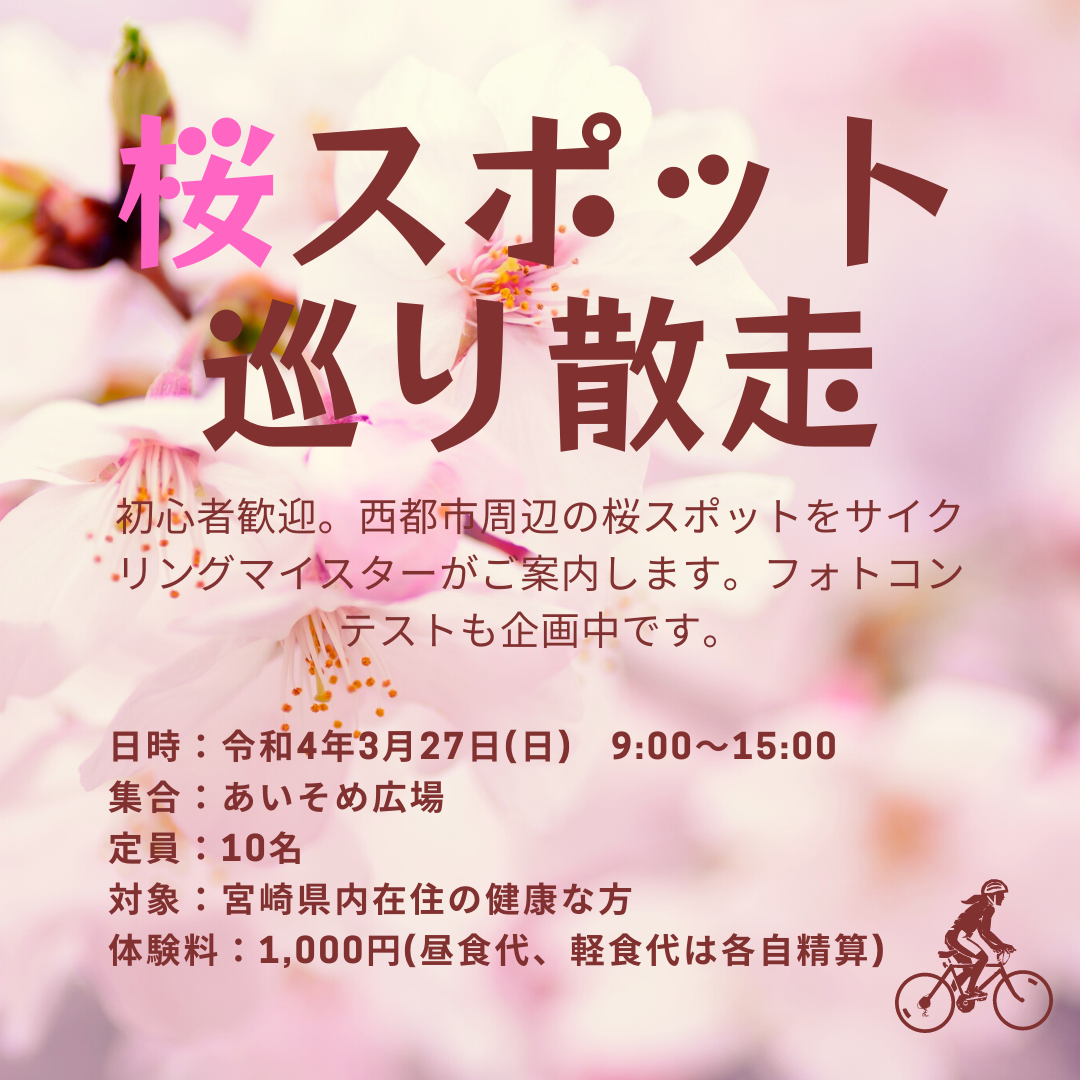 初心者歓迎。西都市周辺の桜スポットをサイクリングマイスターがご案内します。フォトコンテストも企画中です。