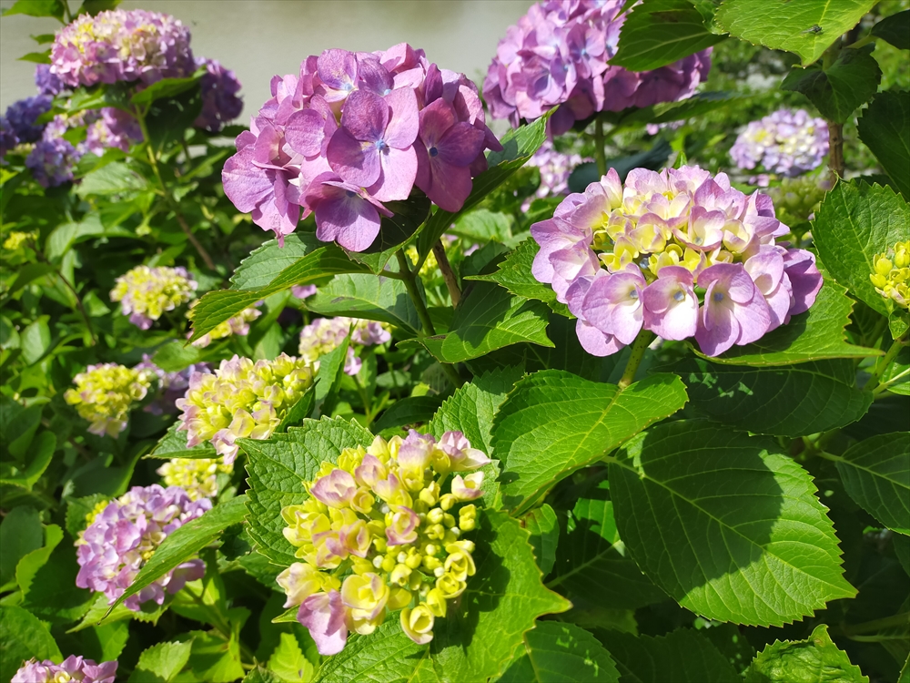 あじさいが咲いている堤防は、2024年8月(予定)まで工事の為全面通行止めとなっています。花見は来年までお待ちください。(2024年6月)