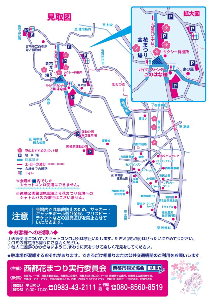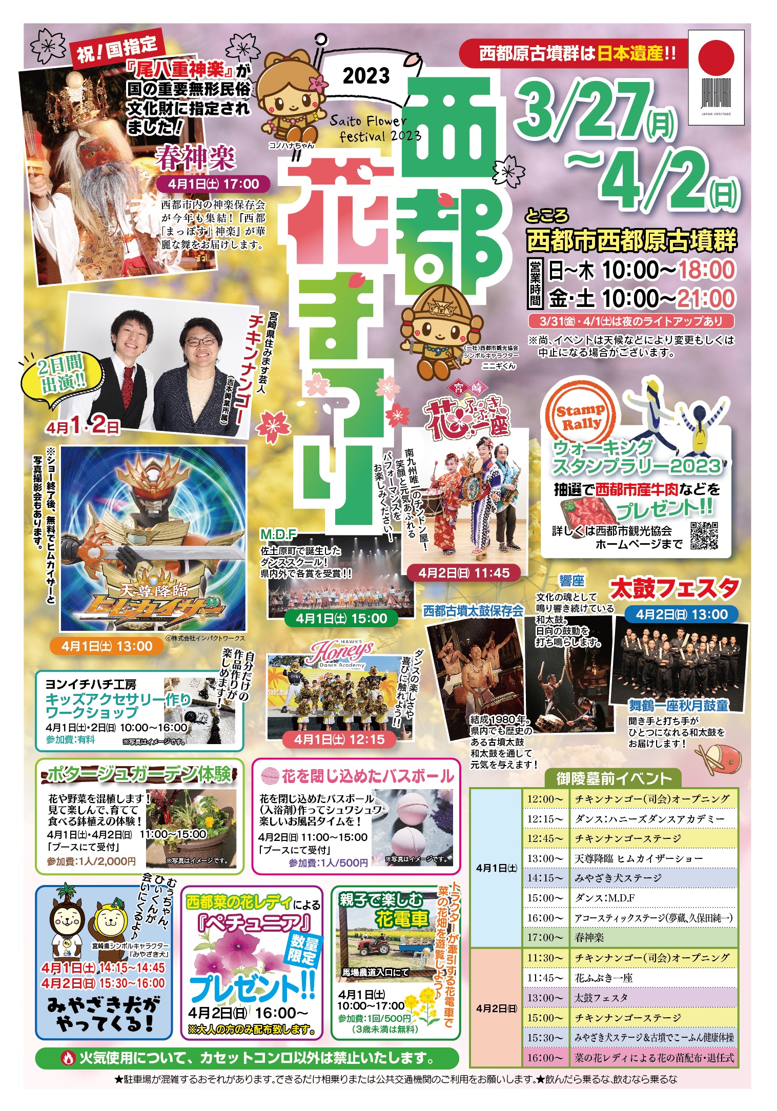 | 主催・お問い合わせ | 西都花まつり実行委員会 TEL 0983-43-2111(西都商工会議所) ※平日のみ9:00~17:00 TEL 080-8560-8519 ※土・日限定 |
