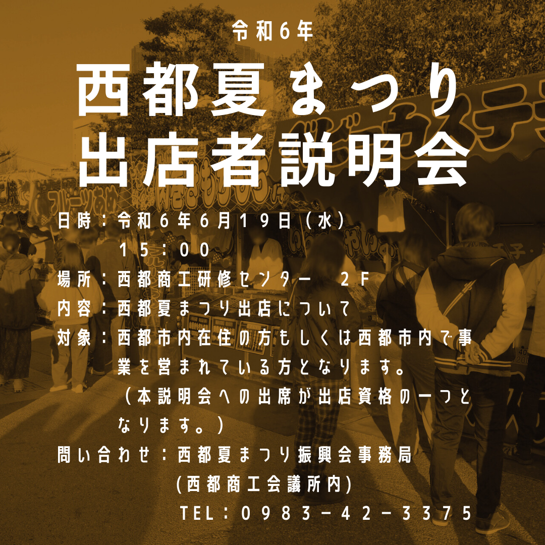令和6年7月19日から7月21日にかけて、西都市街地で開催する西都夏まつりにおける出店希望者向けの説明会を下記のとおり開催いたします。