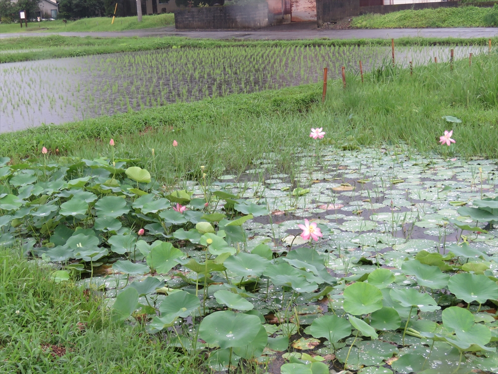 昨年、妻北地域づくり協議会の方々によって記紀の道沿いにハス田が作られ、大賀ハスの移植が行われました。