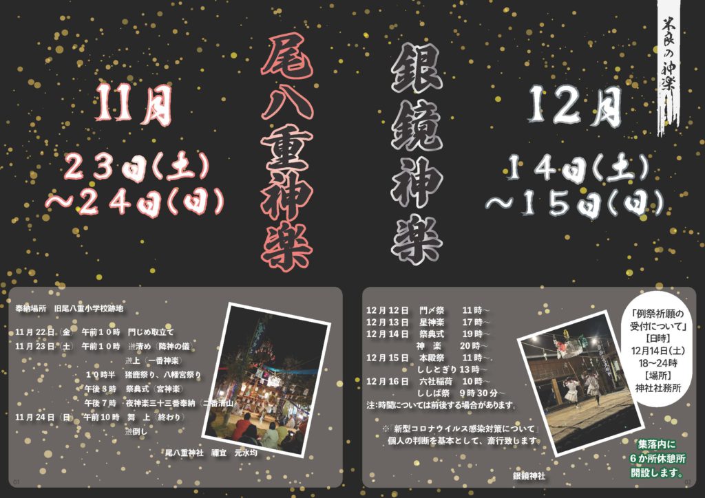 今年の尾八重(おはえ)神楽、銀鏡(しろみ)神楽の奉納は以下の日程で行われます。