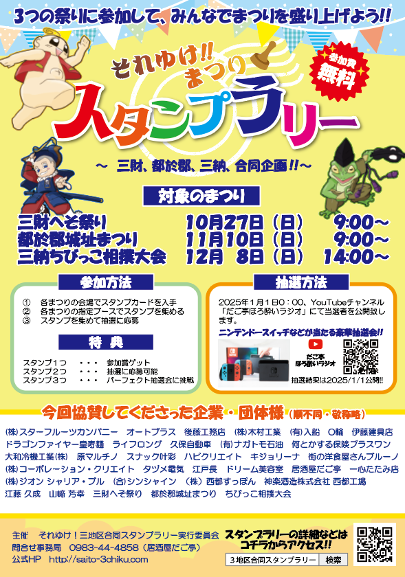 | 主催・お問合せ | それゆけ!三地区合同スタンプラリー実行委員会 電話:0983-44-4858(居酒屋だご亭) |