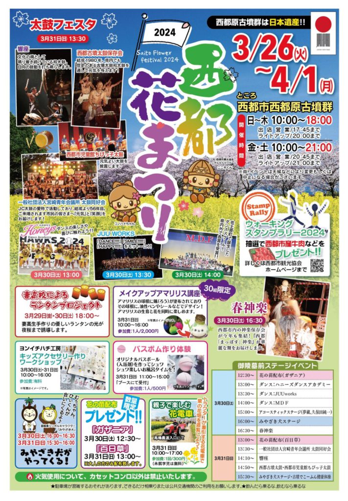 | 主催・お問い合わせ | 西都花まつり実行委員会 TEL 0983-43-2111(西都商工会議所) ※平日のみ9:00~17:00 TEL 080-8560-8519 ※土・日限定 |