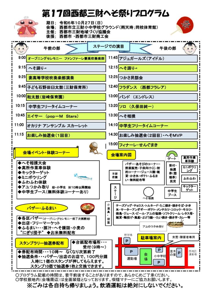 | お問い合わせ | 三財へそ祭り実行委員会事務局(三財地域づくり協議会内) 電話: 0983-44-5831 |
