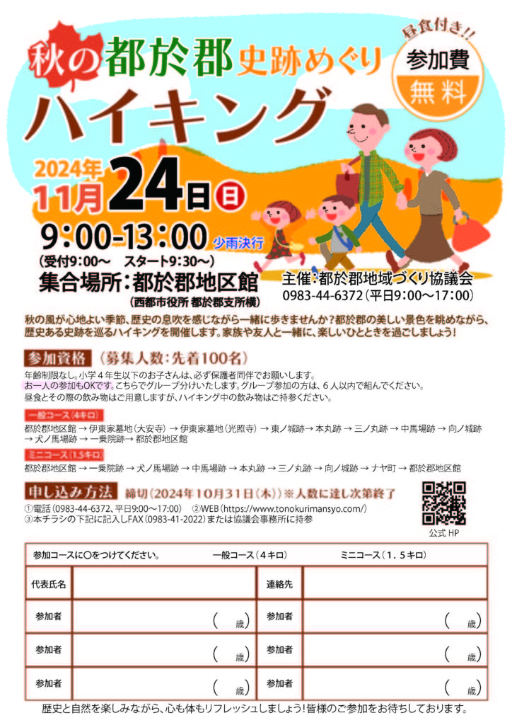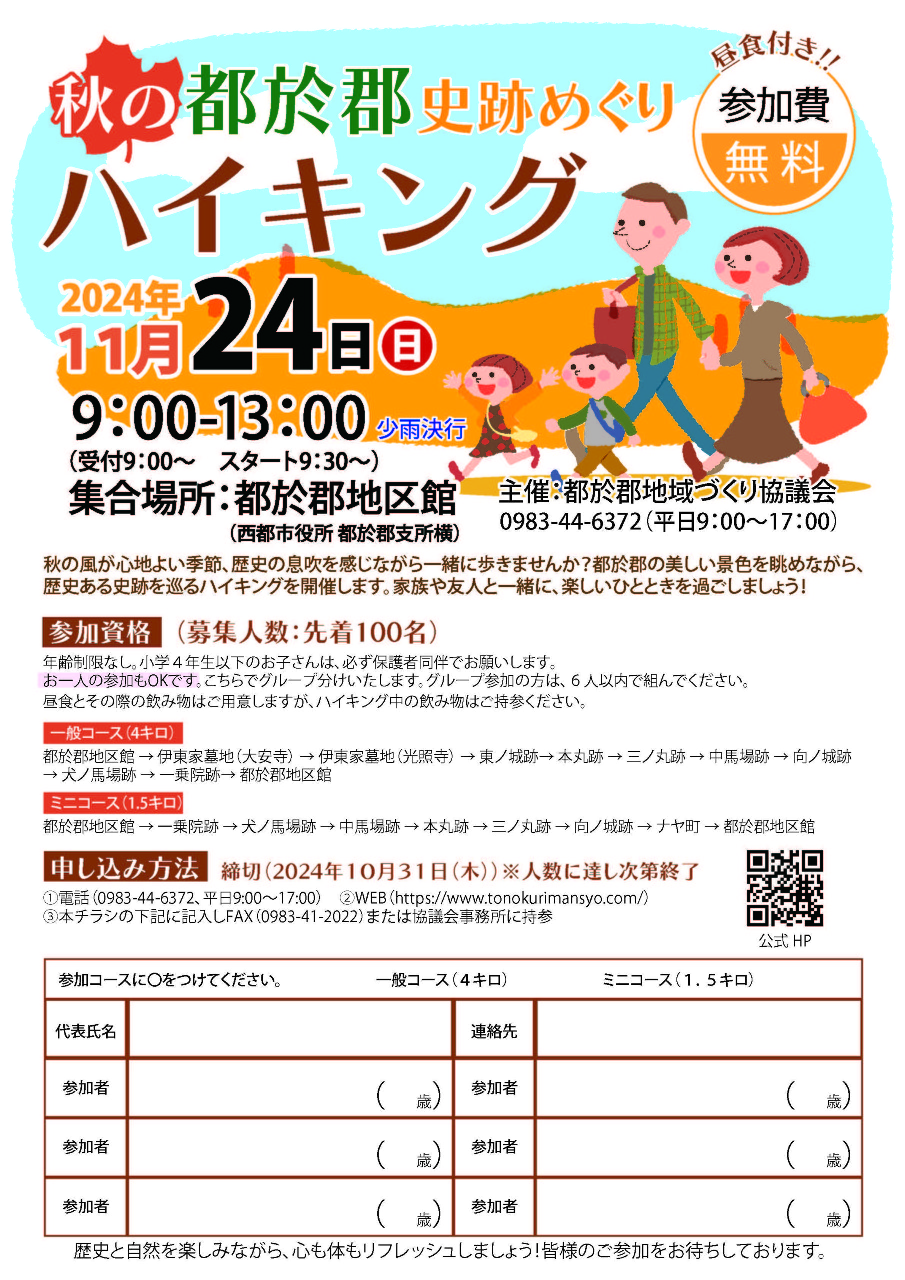 都於郡地域づくり協議会では、都於郡の秋を楽しみながら、史跡を巡るハイキングを開催します。ぜひ、ご参加ください。