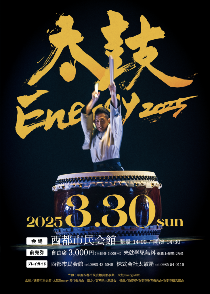 令和7年3月30日(日)に西都市民会館にて「太鼓Energy2025」が開催されます。
