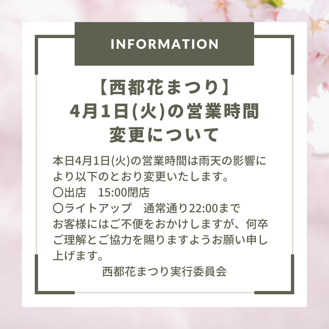 本日4月1日(火)の営業時間は雨天の影響により以下のとおり変更いたします。