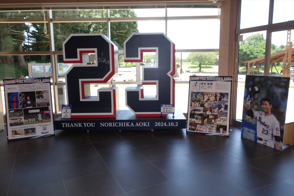 このはな館では元ヤクルト・スワローズで日向市出身の青木宣親さんのモニュメントを設置しています。