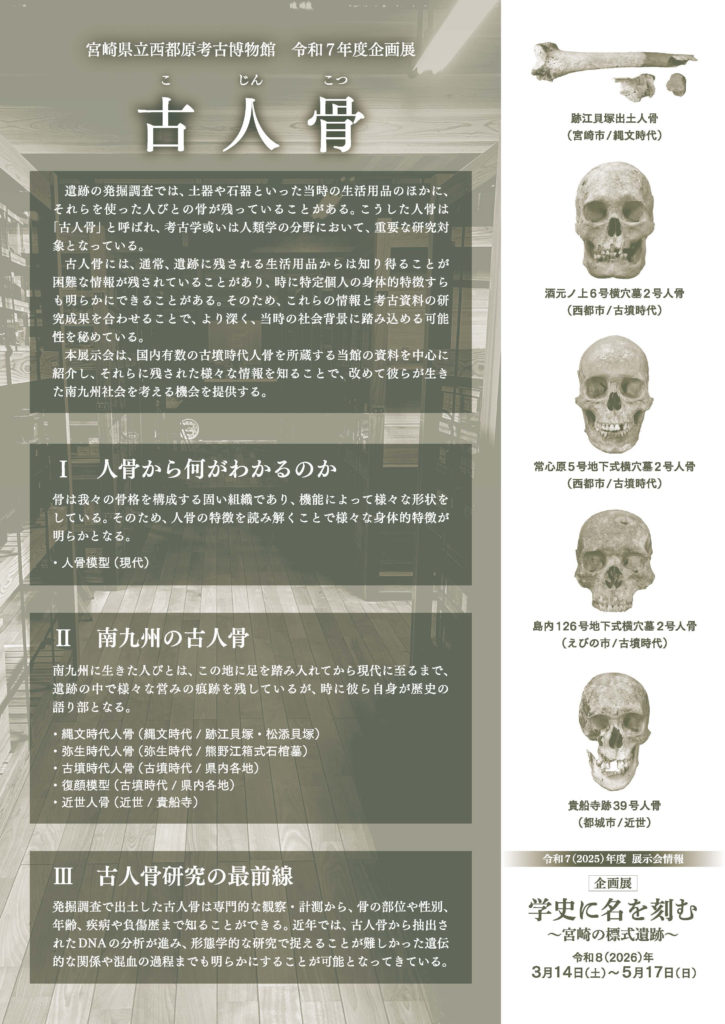 西都原考古博物館では、企画展「古人骨」(こじんこつ)を以下のとおり開催します。