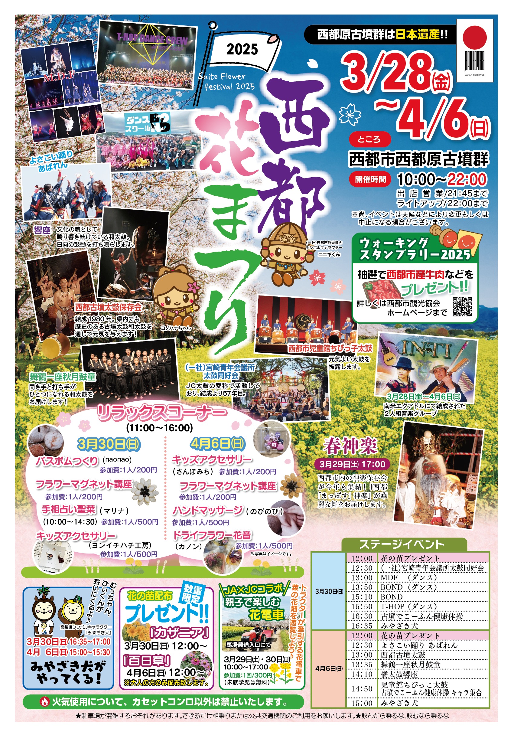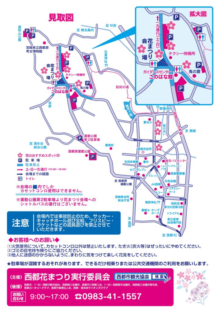 | 主催・お問い合わせ | 西都花まつり実行委員会 9:00~17:00 TEL 0983-41-1557(西都市観光協会) |