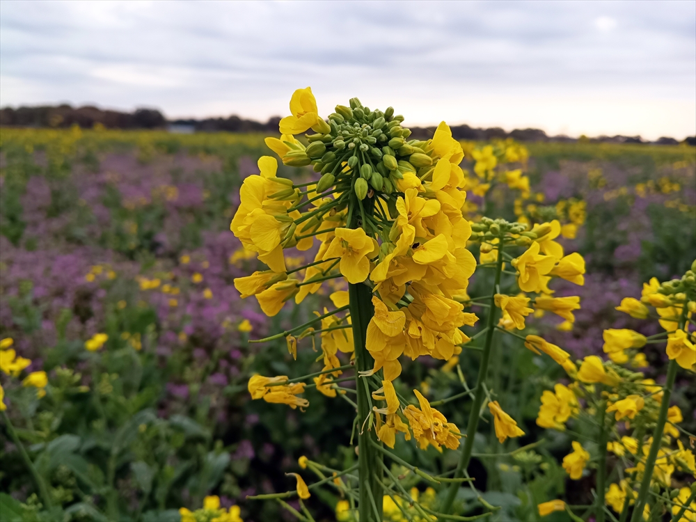 イベント広場周辺の菜の花は8分咲き程度で見頃を迎えています。