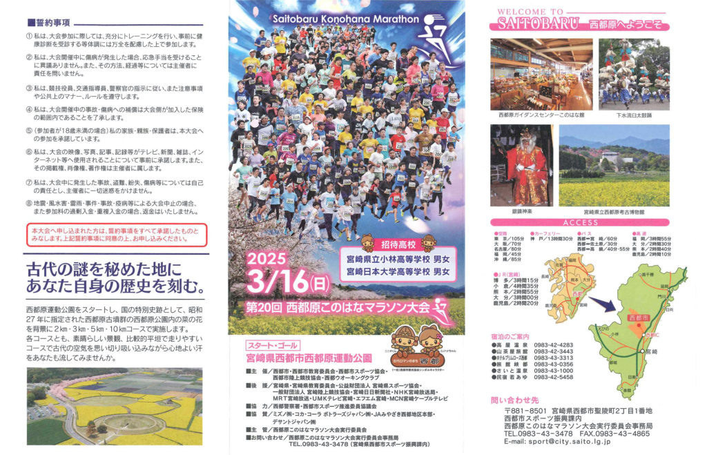 | 問い合わせ先 | 〒881-8501 宮崎県西都市スポーツ振興課内 西都原このはなマラソン大会実行委員会事務局 TEL 0983-43-3478 FAX 0983-43-4865 E-mail:sport@city.saito.lg.jp |