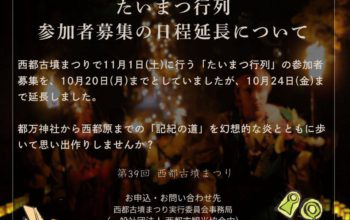 新着情報 NEWS 2025.10.20 【開花情報4】西都原のコスモス 本日の天気はくもり。10月20日(月)の西都原の開花状況をお知らせします。 コスモスは全体的に開花が... 2025.10.20 【このはな館】さるまわしパフォーマンスのお知らせ 西都原ガイダンスセンターこのはな館では秋の季節イベントとしてさるまわしパフォーマンスを開催します。大... 2025.10.20 受付終了【第39回西都古墳まつり】たいまつ行列参加者募集のお知らせ 定員に達しましたので締め切らせていただきました。たくさんのご応募ありがとうございました。 西都古墳ま... 2025.10.15 【開花情報3】西都原のコスモス 本日の天気は晴れ。10月15日(水)の西都原の開花状況をお知らせします。 コスモスは全体的に咲き始め... 2025.10.14 第18回西都三財へそまつり開催のお知らせ 三財へそ祭り実行委員会からのお知らせです。 三財地区では「第18回三財へそ祭り」を開催します。宮崎県... 2025.10.10 【開花情報2】西都原のコスモス 本日の天気は晴れ。10月10日(金)の西都原の開花状況をお知らせします。 コスモスは全体的に成長中で... 2025.10.06 【開花情報1】西都原のコスモス 本日の天気は晴れ。10月6日(月)の西都原の開花状況をお知らせします。 コスモスは全体的に成長中です... 2025.10.06 【このはな館】さるまわしパフォーマンスのお知らせ 西都原ガイダンスセンターこのはな館では秋の季節イベントとしてさるまわしパフォーマンスを開催します。か... 2025.09.20 【西都原考古博物館】国際交流展「千年の至芸~台湾宜蘭 漢本遺跡~」 西都原考古博物館からのお知らせです。 西都原考古博物館では、国際交流展「千年の至芸(しげい)... 2025.09.17 【このはな館】このはな館に来られたお客様にお店のPRをしてみませんか?西都市内周遊カード参加店舗募集のお知らせ 西都原ガイダンスセンターこのはな館では、来館されたお客様を対象に西都市内のお店を紹介する新たな取り... 2025.09.12 『さいとマチナカマルシェ』開催のお知らせ 「季節を楽しみ 明日の暮らしをつくるマルシェ」をコンセプトに開催される「さいとマチナカマルシェ」。9... 2025.09.04 【このはな館】台風接近に伴う臨時休館のお知らせ お客様各位 台風接近に伴い西都原ガイダンスセンターこのはな館は、以下のとおり全館臨時休館することと致... « 1 2 3 4 5 6 7 8 … 83 » ホーム 新着一覧 フォトアルバム 西都市の天気 西都原ガイダンスセンターこのはな館 グリーンツーリズム スポーツランド ニニギくん&コノハナちゃん 年間イベントカレンダー 体験する 観光パンフレット おいでよ花のまち西都市へ 観光ガイド フードデリバリー西都 動画 【宮崎県西都市PR動画】古代ロマン西都 古代人のモニュメント-南国宮崎の古墳景観-(日本語ショート)