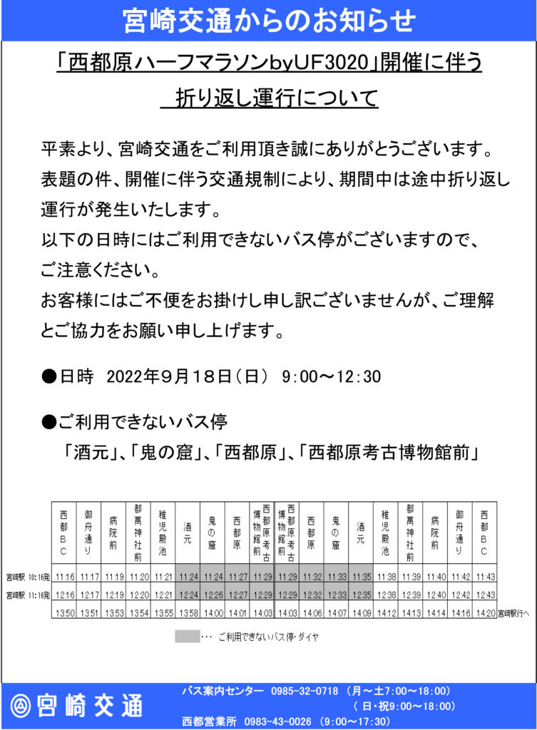 それに伴い、規制時間帯は宮崎交通バスの途中折り返し運行が発生します。ご利用できないバス停がございますので、ご注意ください。