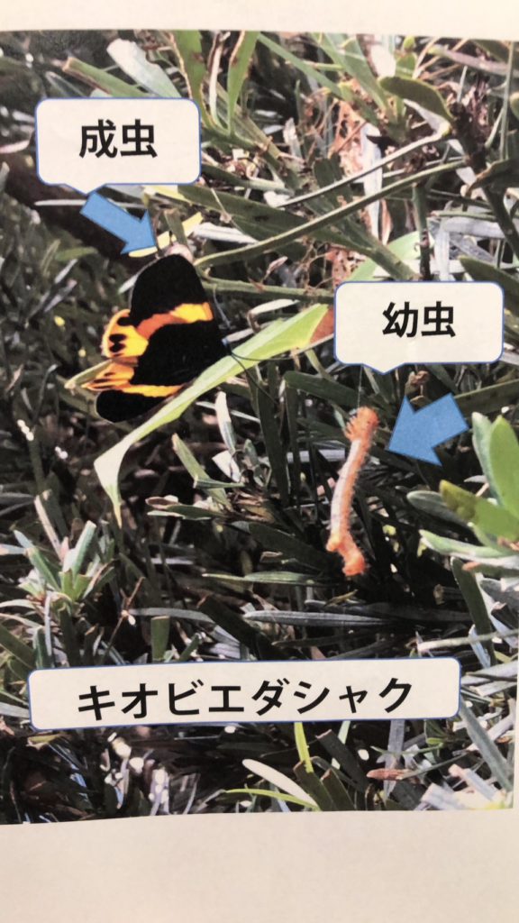 幼虫は、5cm程のシャクトリムシで頭やお尻がオレンジ色をしています。