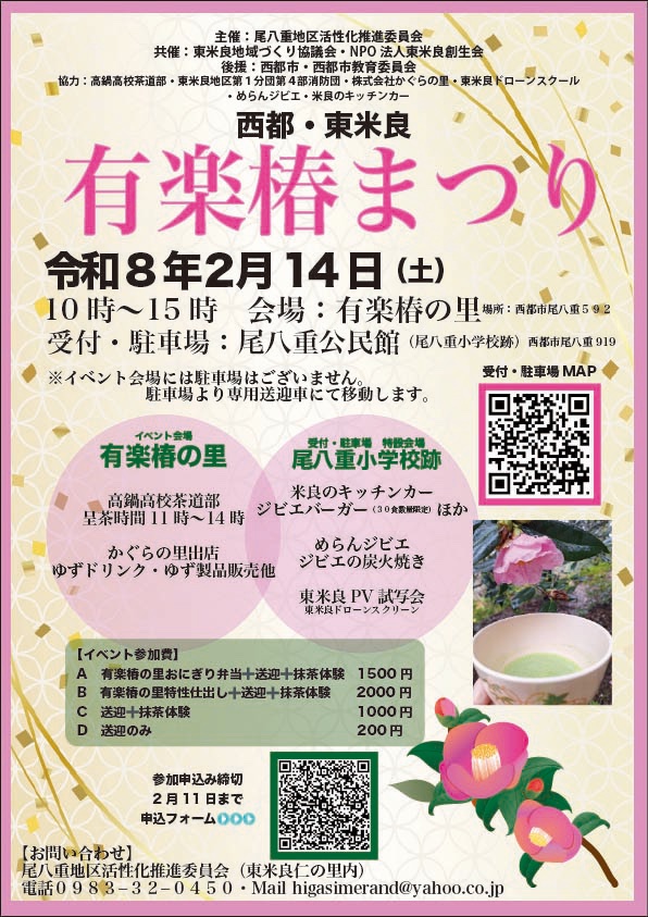| 受付・駐車場 | 尾八重公民館(尾八重小学校跡) 【有楽椿まつり参加申込フォーム】 https://forms.gle/AsguQK5Vdhv7BeJw9 |