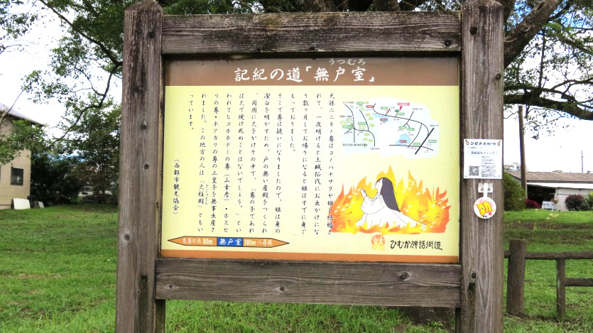「無戸室」は、夫の天孫ニニギノミコトから“一夜の契(ちぎり)で身ごもった”ことを疑われた妻コノハナサクヤヒメが、自分の身の潔白を証明するために、戸の無い産屋『無戸室(うつむろ)』に入り、炎の中で3人の皇子を生んだと伝えられているものです。コノハナサクヤヒメは、赤々と燃え盛る炎の中で長男ホデリノミコト(火照命:海佐知毗古)、炎の勢いが小さくなった時に二男ホスセリノミコト(火須勢理命)、炎が小さく遠のいていく時に三男ホオリノミコト(火遠理命:山佐知毗古)の三人の皇子を無事出産しました。